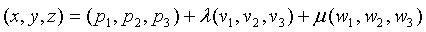 1.-Modifica los valores de l y m y verás que el punto se desplaza por la superficie del plano. Estás trabajando en un plano fijo. 2.-Observa que el vector de posición del punto X es suma de los tres que intervienen en la ecuación. Recuerda que debes girar la escena para obtener el mejor punto de vista. |