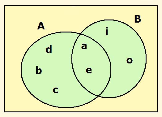 Así, por ejemplo, si A = { a, b, c, d, e} y B = { a, e, i, o}, entonces la unión de dichos conjuntos estará formada por todos los elementos que estén en alguno de los dos conjuntos, esto es: A A la derecha, se representa dicha unión. |