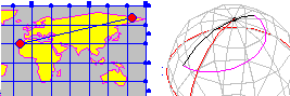 | Mueve el punto rojo por el plano y observa las distancias reflejadas en rojo y en azul (en el plano y en la esfera). Verás que si te acercas a los polos la distancia azul disminuye mientras que la roja se conserva. En principio estas distancias corresponde con 30 grados de Norte-Sur y 30 de Este-Oeste; varía el ángulo y repite la observación. | |||