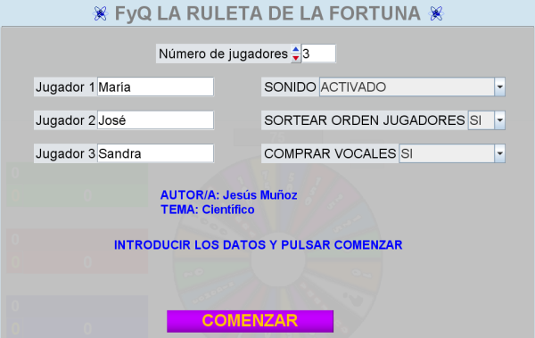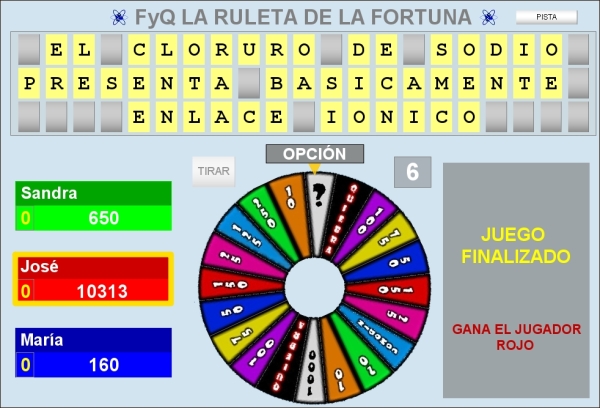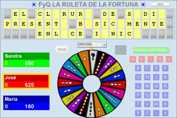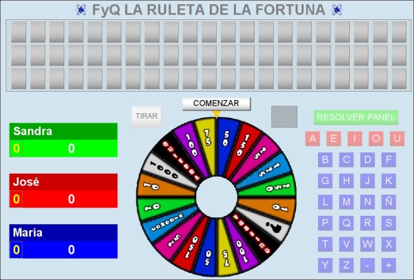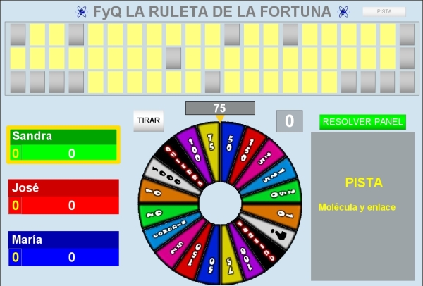 En este apartado vamos a tratar como se desarrollaría una partida del juego de "LA RULETA DE LA FORTUNA", comentando las principales características del mismo. Se ha tomado como ejemplo una de sus versiones en la que los contenidos son de Física y Química y ya vienen elaborados dentro del juego.